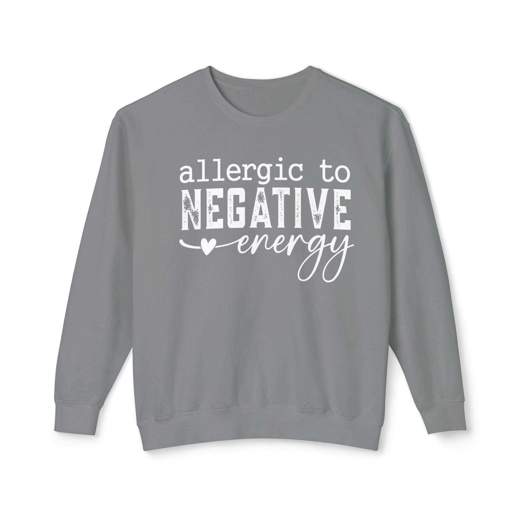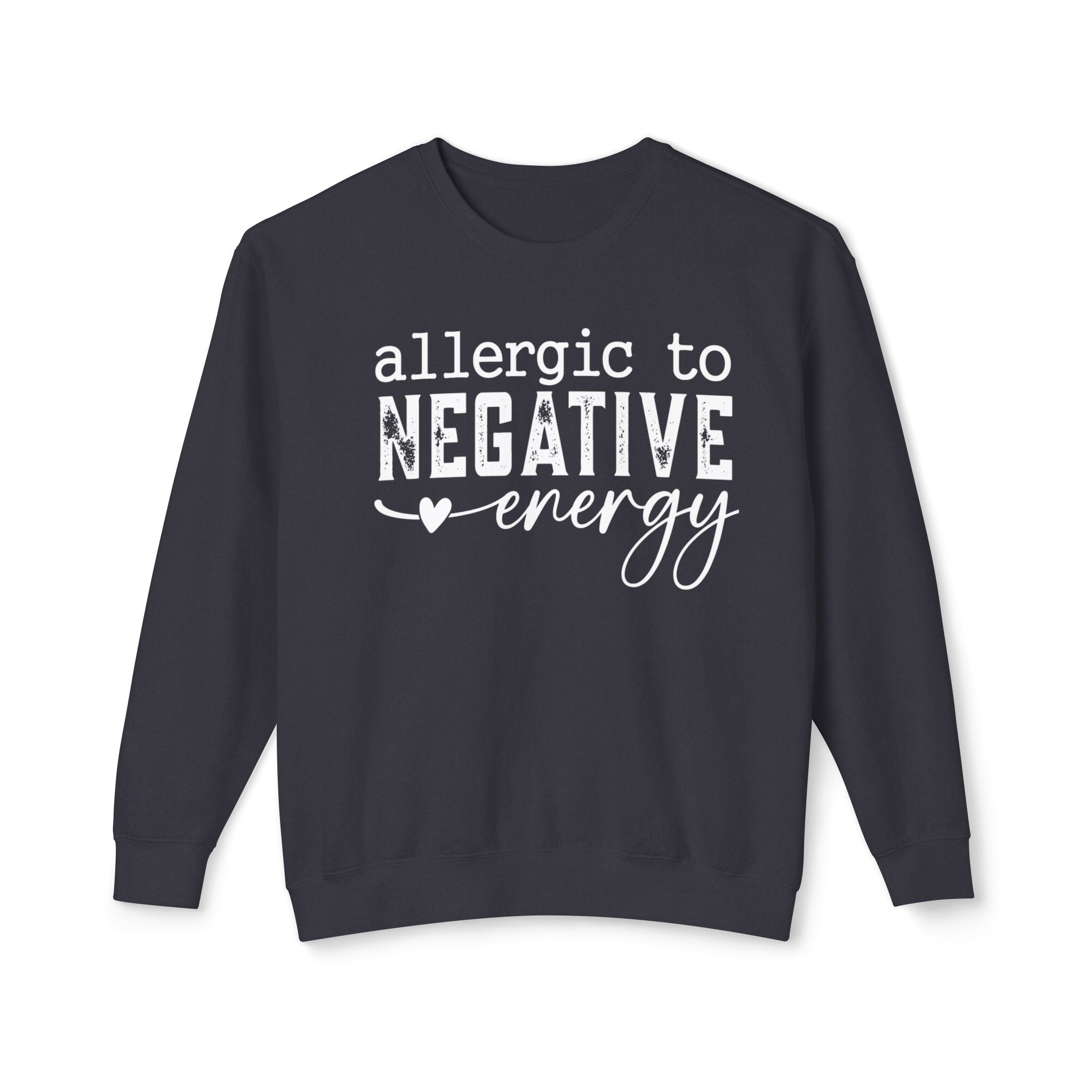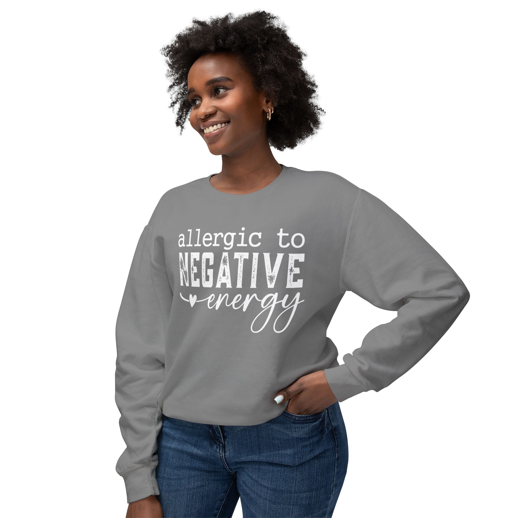 Soft, light, and quietly confident — this crewneck sweatshirt reads “allergic to NEGATIVE energy” in a hand-lettered mix of bold and script. It sits relaxed on the shoulders and moves with you: breathable 100% ring-spun...
